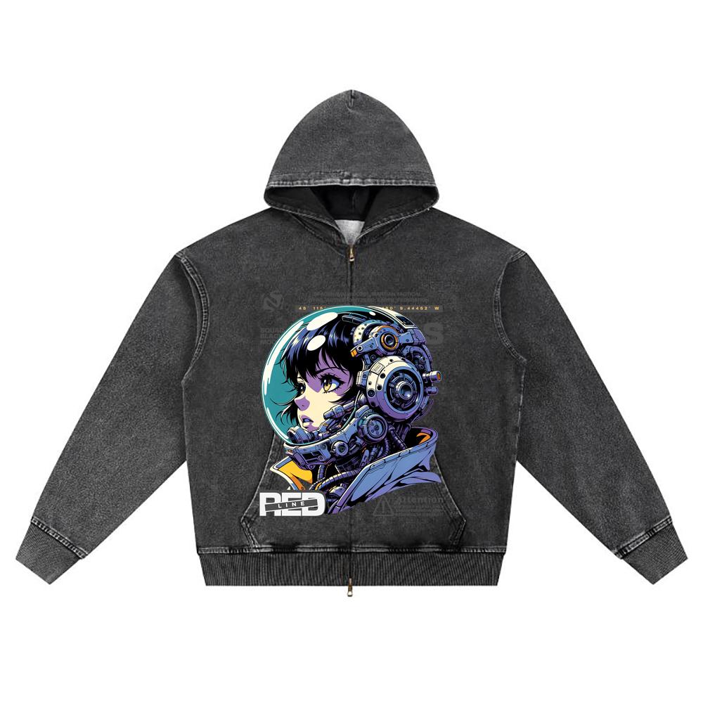 DTG Print Knitted Denim Zip-Up Hoodie Cartoon Graphic Brother Print Zipper Hoodies