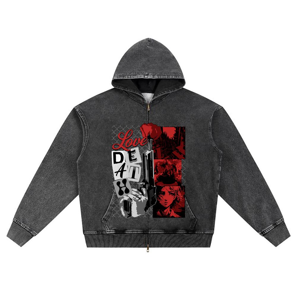 DTG Print Knitted Denim Zip-Up Hoodie Love Death Brother Print Zipper Hoodies