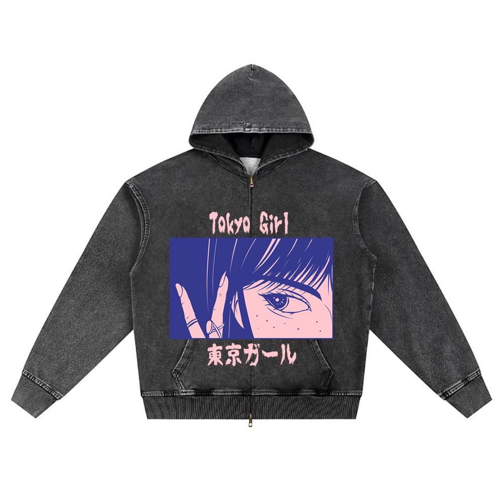 DTG Print Knitted Denim Zip-Up Hoodie Anime Streetwear 27 Brother Print Zipper Hoodies