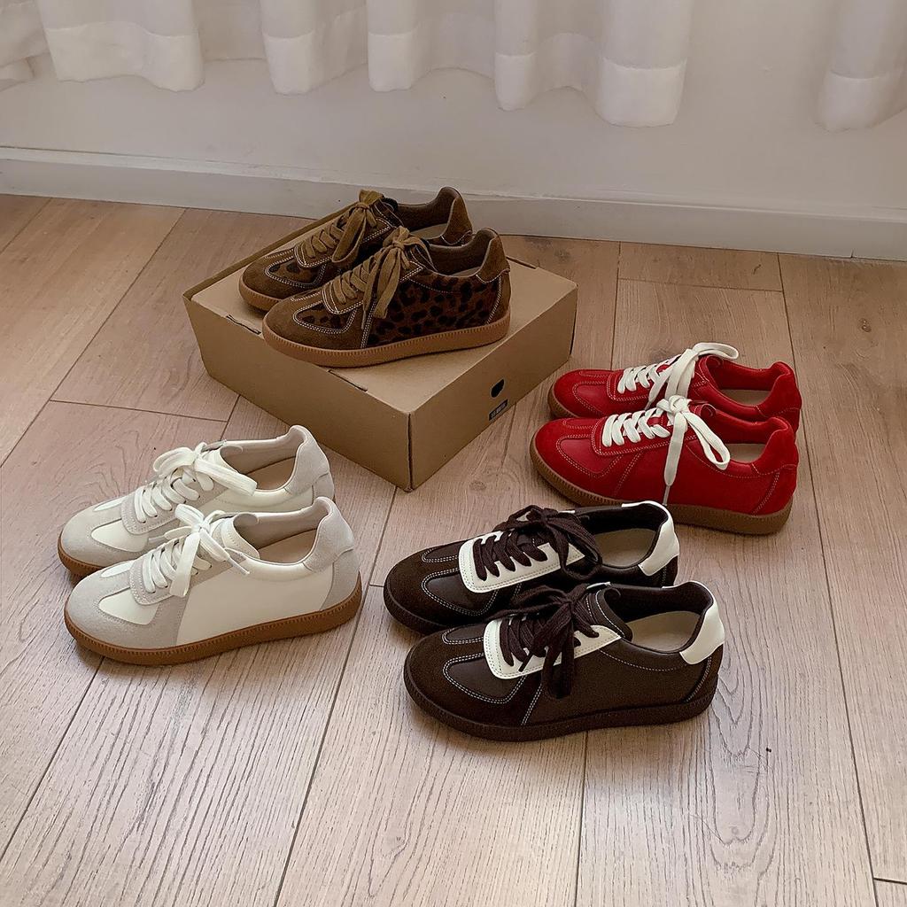 Step into a stylish, vintage-inspired look with these Women's Retro Colorblock Leather German Trainer Sneakers, perfect for the 2025 autumn season. Crafted with a genuine leather upper, these sneakers offer both durability and a premium feel. Designed for females, they feature a thick rubber sole that provides excellent traction and a comfortable stride. The fiber lining ensures a cozy fit, while the lacing closure allows for a secure and adjustable fit. Embrace the casual skate style with these versatile sneakers, perfect for adding flair to any casual ensemble.