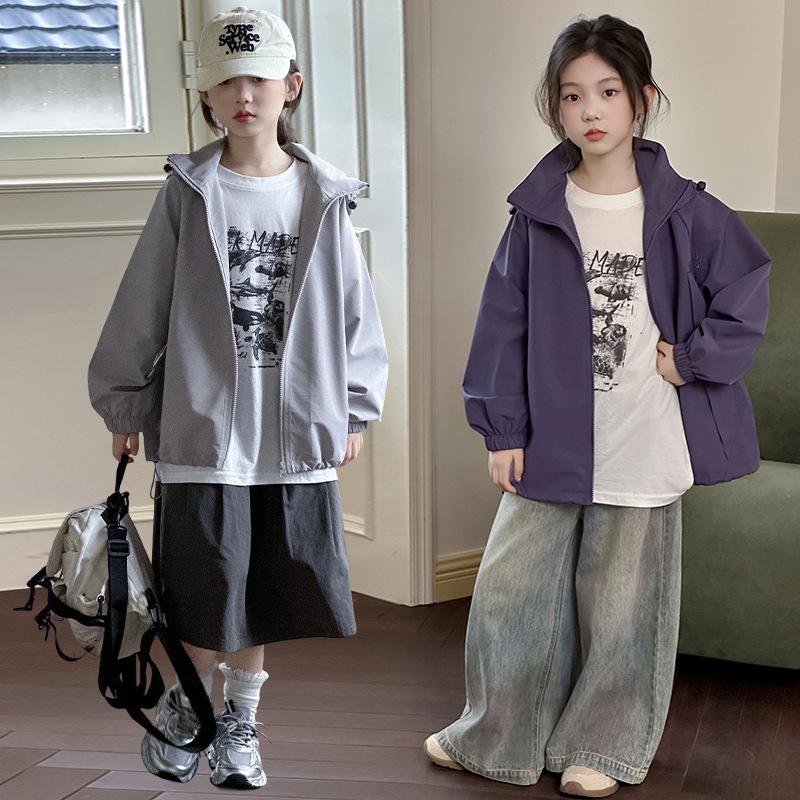 Girls' Sporty Hooded Windbreaker - Embroidered, Big Kids' Jacket for Autumn & Spring