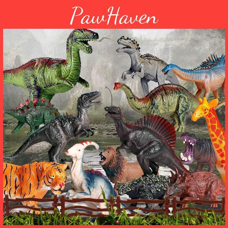 This realistic dinosaur and animal model set features hollow plastic figures, including T-Rex, Triceratops, Velociraptor, and more, measuring approximately 6 to 12 cm tall. Designed for educational display and collection, these static models support imaginative play and learning. Made of durable, lightweight plastic, they are easy to clean with a damp cloth.