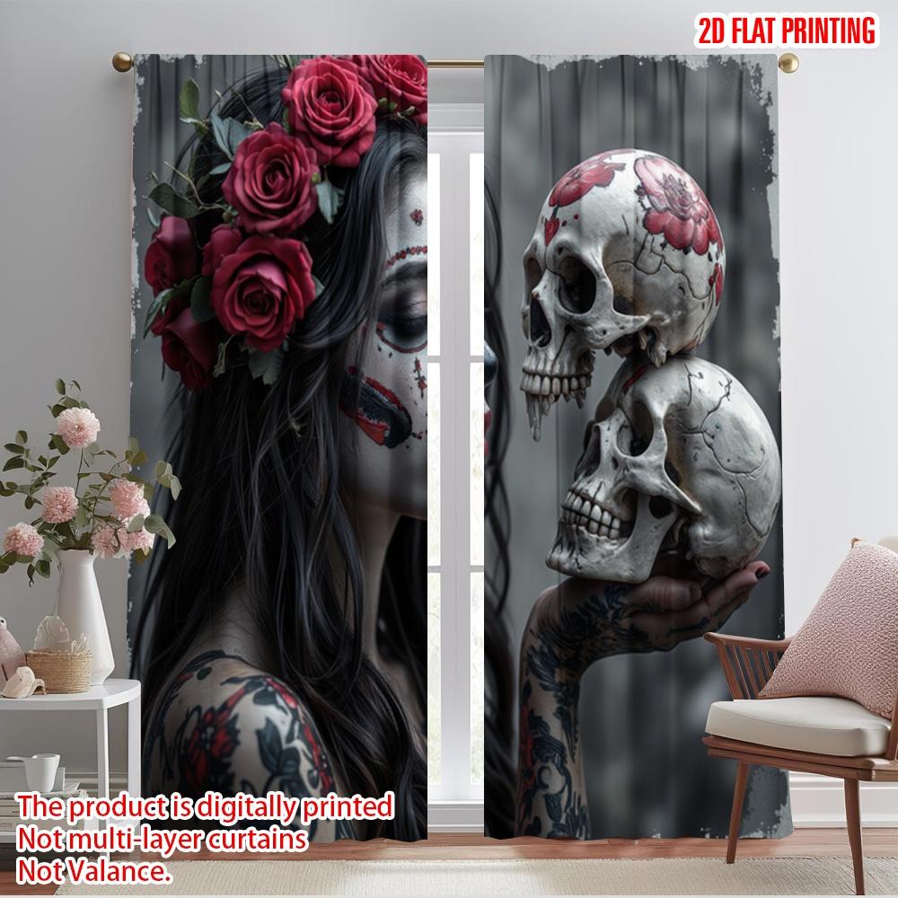 2pcs,2D Plane Printing Curtains Digital Printed Gothic Roses Skulls Durable 100% Polyester Fabric (without Rod) Versatile All
