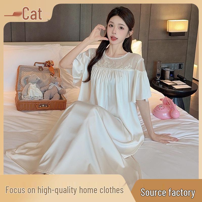 Indulge in the ultimate comfort with this light and breezy nightdress, perfect for summer evenings at home. Crafted from luxurious artificial silk material combined with delicate French lace, this nightdress offers a sophisticated and elegant look. The unique ice silk fabric ensures a cool and soothing touch against the skin, ideal for warm weather. Featuring a 1/2 sleeve length, it provides just the right amount of coverage while maintaining a relaxed and airy feel. Experience elegance and comfort with this exquisite nightwear piece.