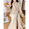 Women's 2025 Autumn/Winter Plush Pajama Set: Vertical Stripe Robe & Lined Nightgown