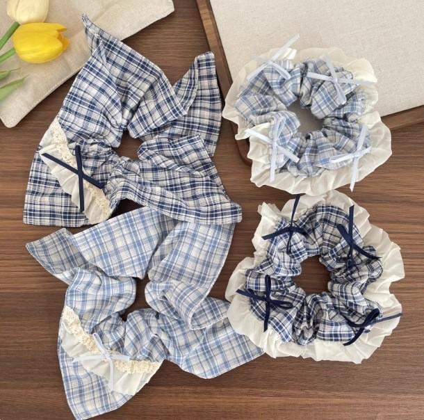 Korean Blue Plaid Bow Scarf Women's Hair Tie & Headband Set