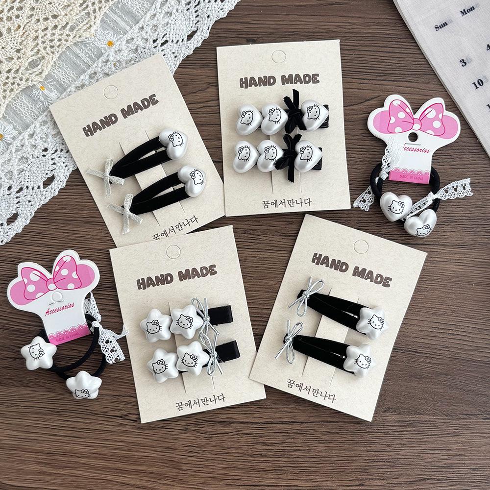 Love Heart Star Kitten Hair Clips & Ties Set: Black & White Elastic Bands, Side Clips, Versatile Bangs Clips for Children