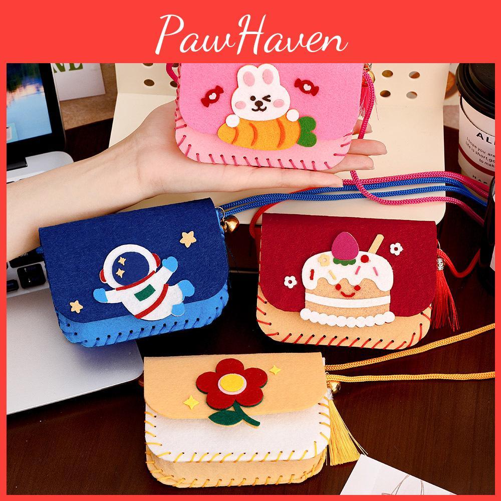 This children's DIY crossbody bag kit features fabric materials, designed for easy hand-sewing. The kit includes colorful fabric pieces in strawberry cake, space explorer, star wish, and milky rabbit themes, perfect for creative projects. Ideal for preschool activities or parent-child bonding, it encourages fine motor skills and imagination. Wipe clean with a damp cloth to maintain the fabric.