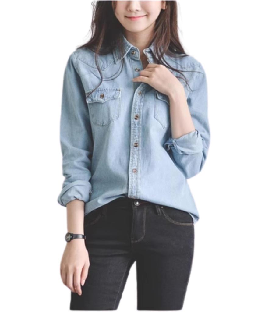 Long Sleeve Denim Dungaree Oxford Solid Indigo Light C&CL Women's Shirt/Blouse, Cotton, Color, Casual, Spring/Fall, (JP, Alphabet, Small, Blue)