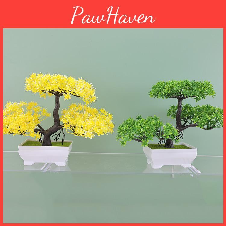 This artificial pine bonsai sculpture features a realistic design and vibrant color options, including green, purple, yellow, red, lotus, pink, and crimson. Made of durable plastic through injection molding, it measures 7.5 inches tall, providing a natural appearance without maintenance.