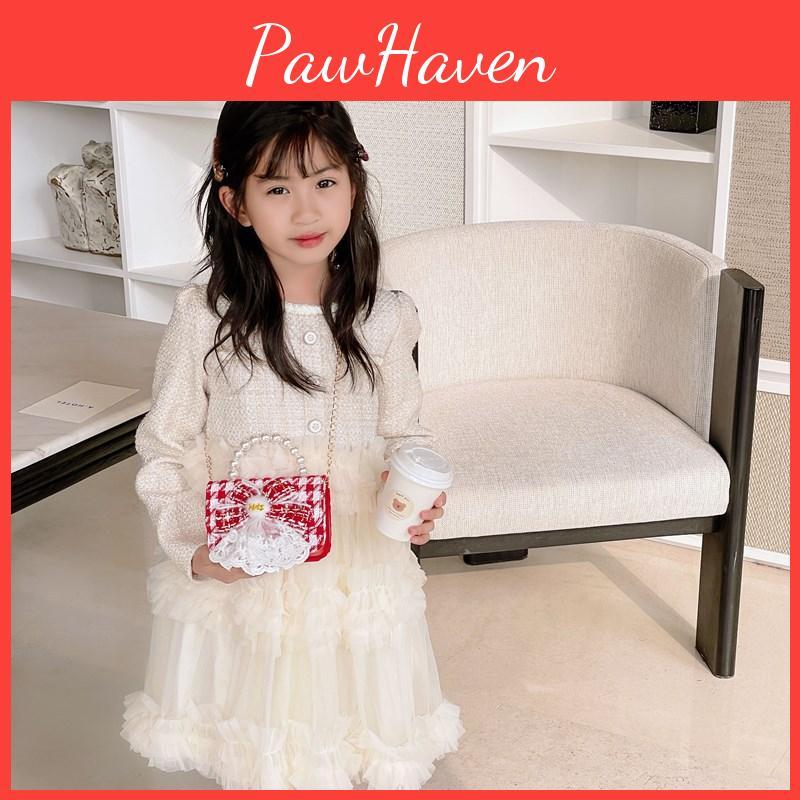 The handbag's standout feature is its eye-catching geometric pattern, which adds a modern twist to a classic design. The red gradient bow, with its luxurious velvet texture, further enhances the handbag's appeal, making it a favorite among little fashionistas. Accents like the playful pom-poms and various red checkered designs create a delightful visual experience, ensuring your child will stand out whether at kindergarten or during playdates.
