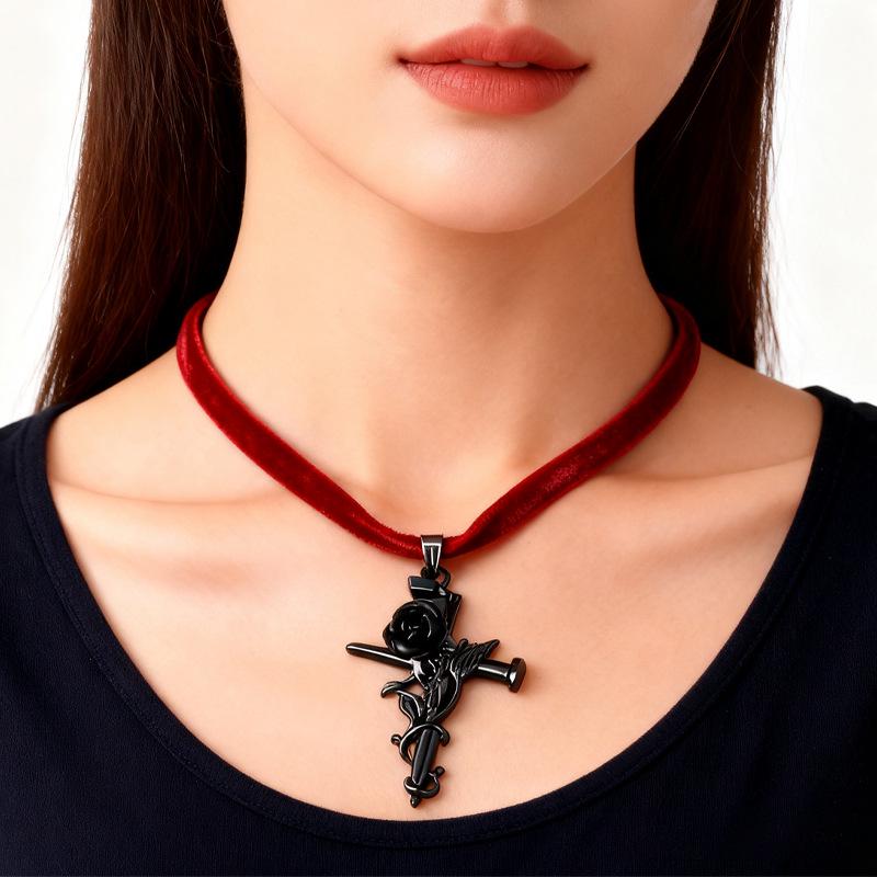 European & American Gothic Velvet Cross Rose Pendant Necklace