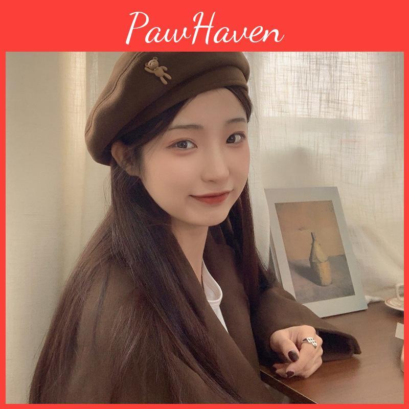 Brown Wool Cozy Beret Artist Hat For Winter Women Men With Cute Bear Design
