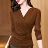 Korean Mesh Print Cross V-neck Bottoming Shirt Women's Fall Inside The Long-sleeved T-shirt Glitter Silk Tops Fashionable Small Shirt