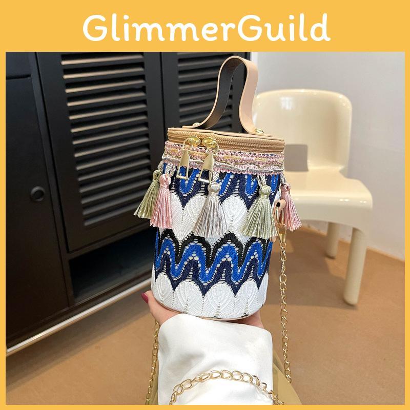 Ethnic Style Tassels Chain Strap Tote Cylinder Crossbody Bag For Women Use Daily