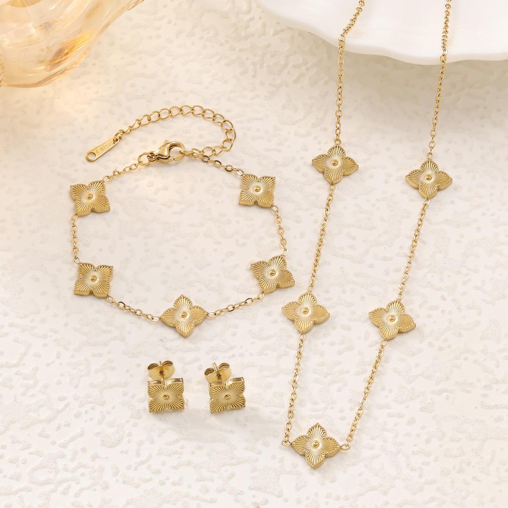 Elegant 18K Titanium Steel Jewelry Set: Laser Stripe Clover Bracelet, Necklace & Stud Earrings