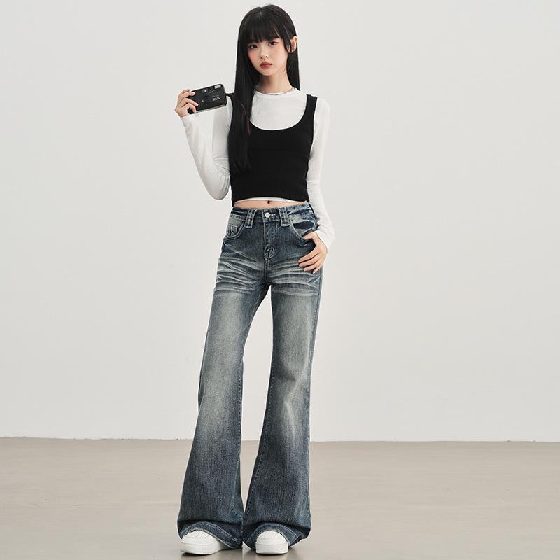 These retro-inspired jeans are crafted from durable denim, offering both comfort and style. Designed with a low waist and a micro flare cut, they create a flattering silhouette that nods to classic fashion trends. The whiskered detailing adds a touch of vintage charm, making them a versatile addition to any wardrobe.