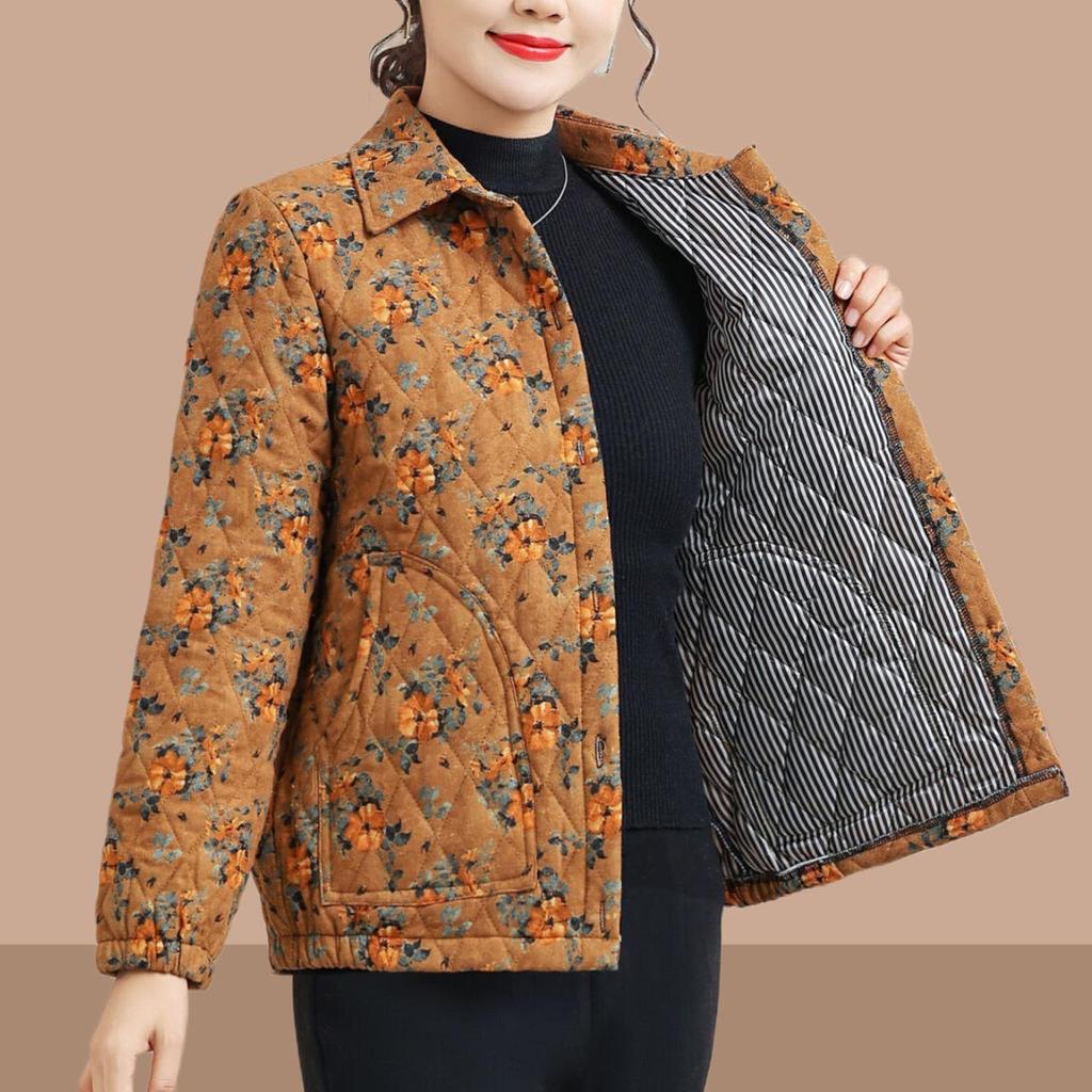 Embrace the chic elegance of autumn and winter fashion with this floral cotton jacket, designed specifically for women who appreciate style and comfort. This medium-thickness outerwear boasts a charming floral pattern and features a turn-down collar, providing a sophisticated touch to any outfit. Crafted with a unique blend of spandex material and chenille fur, it ensures flexibility and a snug fit for those cooler days. Ideal for layering, this jacket is available in small and medium sizes, making it a perfect addition to your seasonal wardrobe.