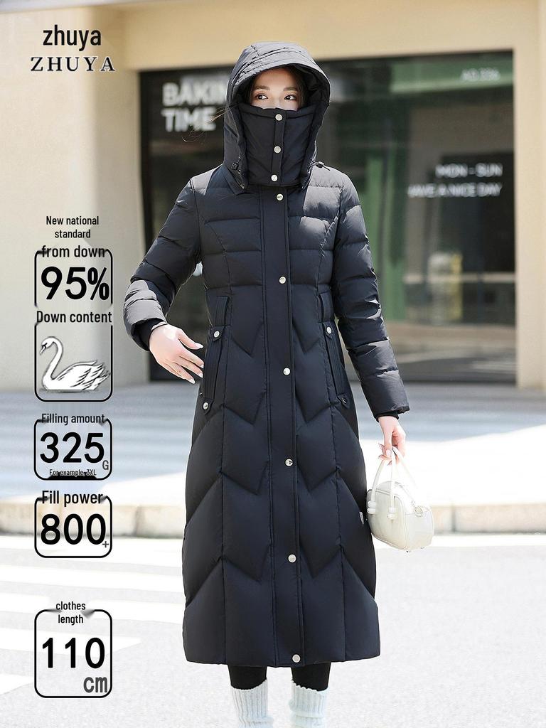 Stay warm and stylish with this women's long winter coat, designed for the modern fashion-forward woman. Featuring a luxurious 95% duck down filling, this thick, insulated jacket ensures superior warmth during the coldest months. Crafted with high-quality polyester both inside and out, its slim fit design elegantly cinches at the waist, highlighting your silhouette while providing a flattering over-the-knee length. Equipped with a hooded neckline for added protection, this coat combines practicality with a chic edge. With long sleeves completing its sophisticated look, this winter fashion staple is perfect for any cold-weather occasion.