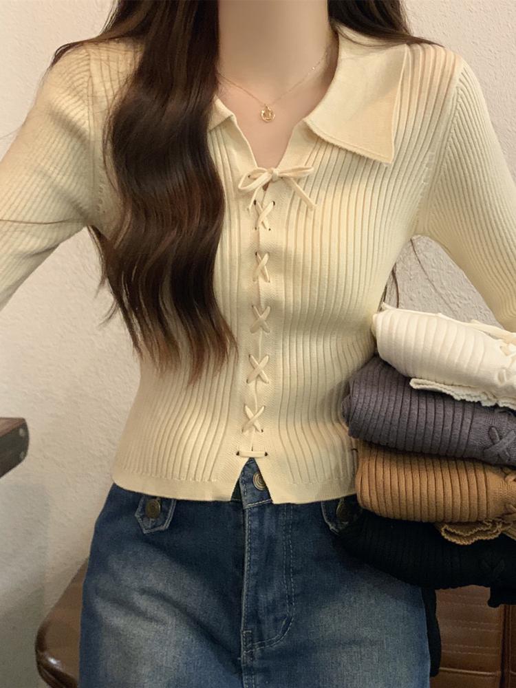 Polo Collar Long Sleeve Knitted Slim Petite Sweater for Women - Early Autumn Collection
