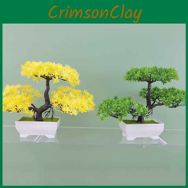 This artificial pine bonsai sculpture features a realistic design and vibrant color options, including green, purple, yellow, red, lotus, pink, and crimson. Made of durable plastic through injection molding, it measures 7.5 inches tall, providing a natural appearance without maintenance.