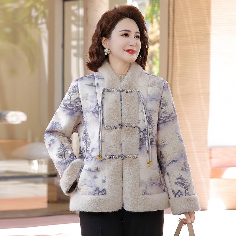 This stylish short warm coat is perfect for middle-aged and elderly women seeking comfort and elegance during the autumn and winter seasons. Crafted from high-quality artificial fur material, it offers a luxurious feel with its faux fur trim, ensuring both warmth and sophistication. Ideal for various occasions, this versatile outerwear seamlessly blends traditional Chinese style with contemporary fashion, providing a chic and cozy option for cooler weather.
