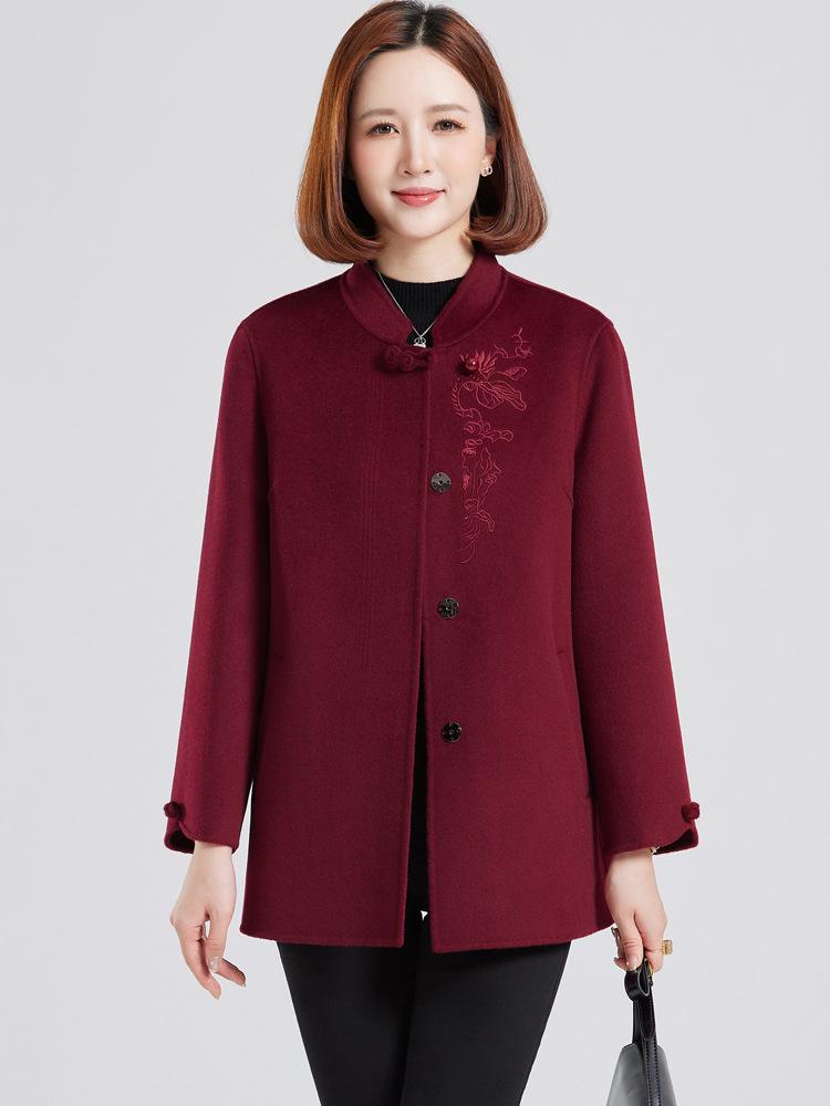 Experience timeless elegance with this beautifully embroidered cashmere coat, designed specifically for middle-aged and elderly women. Crafted from luxurious wool, this overcoat boasts an insulated thickness, ensuring warmth and comfort during the colder autumn and winter months. The coat features a stand neckline and long sleeves, offering a classic silhouette. Practical pockets provide both functionality and style to this exquisite piece of outerwear. Perfect for enhancing any wardrobe with its sophisticated design.