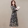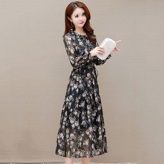 Women's Mid-Length Floral Chiffon Spring Dress - Waist-Slimming, Over-the-Knee, Long-Sleeved Fashion