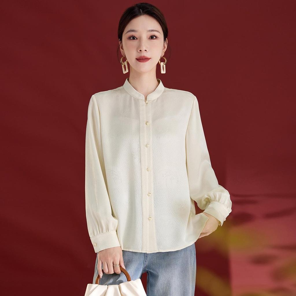 This luxurious women's shirt is crafted from exquisite mulberry silk, offering a sophisticated and elegant addition to your autumn wardrobe. Designed with long sleeves and a stand collar, it features a solid pattern and a loose fit, creating a timeless and versatile look. Perfect for both professional settings and stylish casual outings, this elegant silk top combines comfort with a touch of French sophistication.