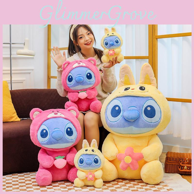 This plush toy features a transforming design inspired by the Stitch character, available in strawberry bear and other themed styles. Made of soft short-pile plush and filled with durable PP cotton, it measures from22 to 58cm . Ideal for childrens playrooms or as a collectible, it offers easy spot cleaning with a damp cloth.
