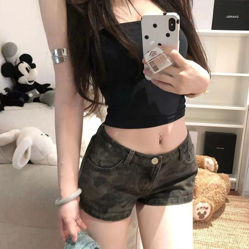 Women's Low-Waisted Camouflage Denim Shorts - Slim Fit, Elastic, Hip-Hugging, Straight Leg, Versatile Summer Wear