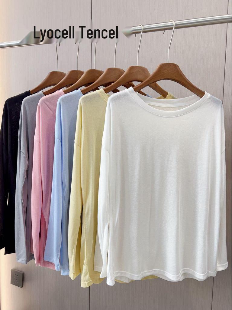 Women's Lyocell Tencel Long Sleeve Round Neck Loose Knit Sunscreen Cover-Up Top