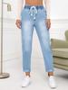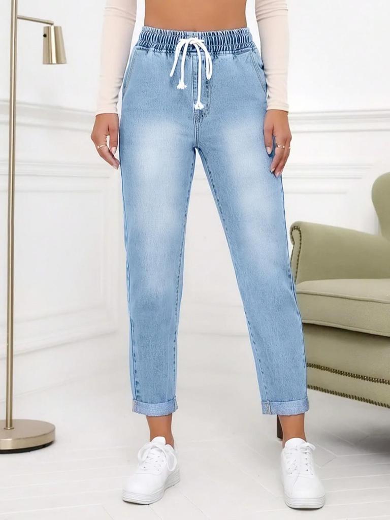 These women's jeans offer a perfect blend of comfort and style, featuring a mid-rise elastic waist with a convenient drawstring for a custom fit. Made from high-quality denim, they promise durability and a classic casual vibe. The unique ripped design adds an edgy touch, while lace decorations provide a hint of feminine charm. Ideal for everyday wear, these jeans effortlessly pair with a variety of tops for a laid-back yet fashionable look.