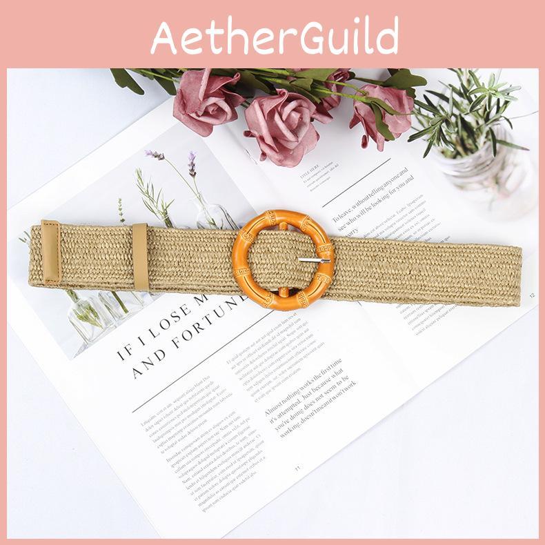 This woven style women's belt features a round buckle made of durable plastic. Crafted with a braided design, it adds texture and visual interest to various outfits. The belt is suitable for beachwear, casual dresses, and summer outings, providing a stylish accent. It comes in multiple colors, including white, black, khaki, and multicolor,Easy to care for, wipe clean with a damp cloth to maintain its woven appearance.