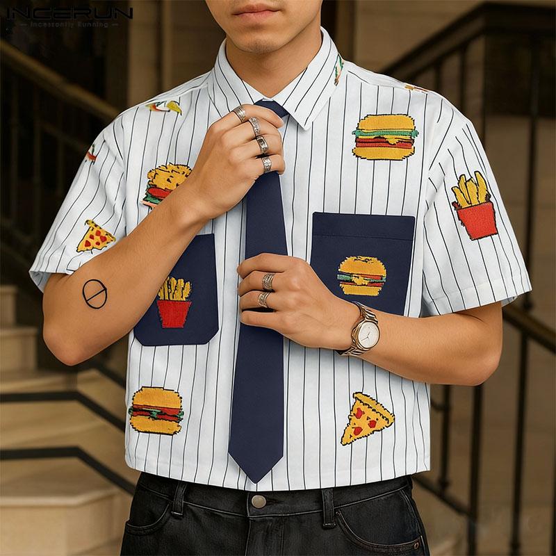 INCERUN Men Tie Lapel Neck Short Sleeve Button Down Cartoon Print Casual Cropped Shirts