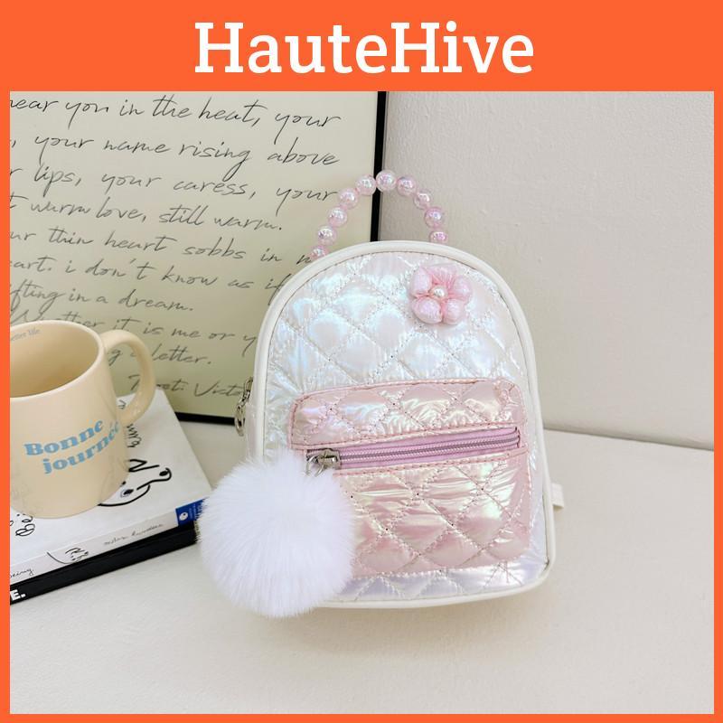 Gradient Backpack Kids With Pearl Handheld Plush Ball And Decoration Flower