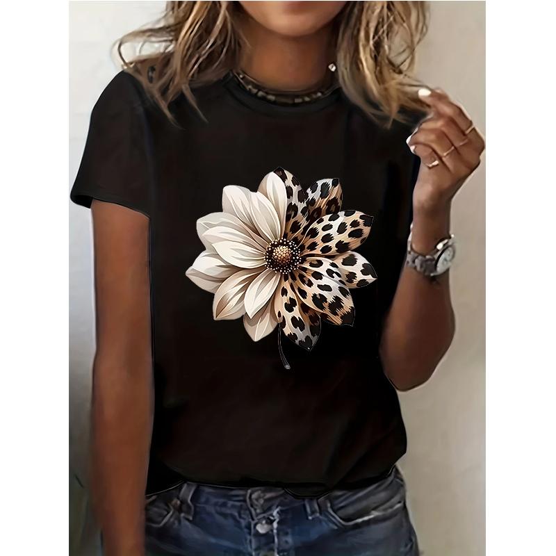 Women's Leopard Print Casual Round Neck T-shirt Top T-shirt, Seasonal Short Sleeved T-shirt, Women's T-shirt Clothes
