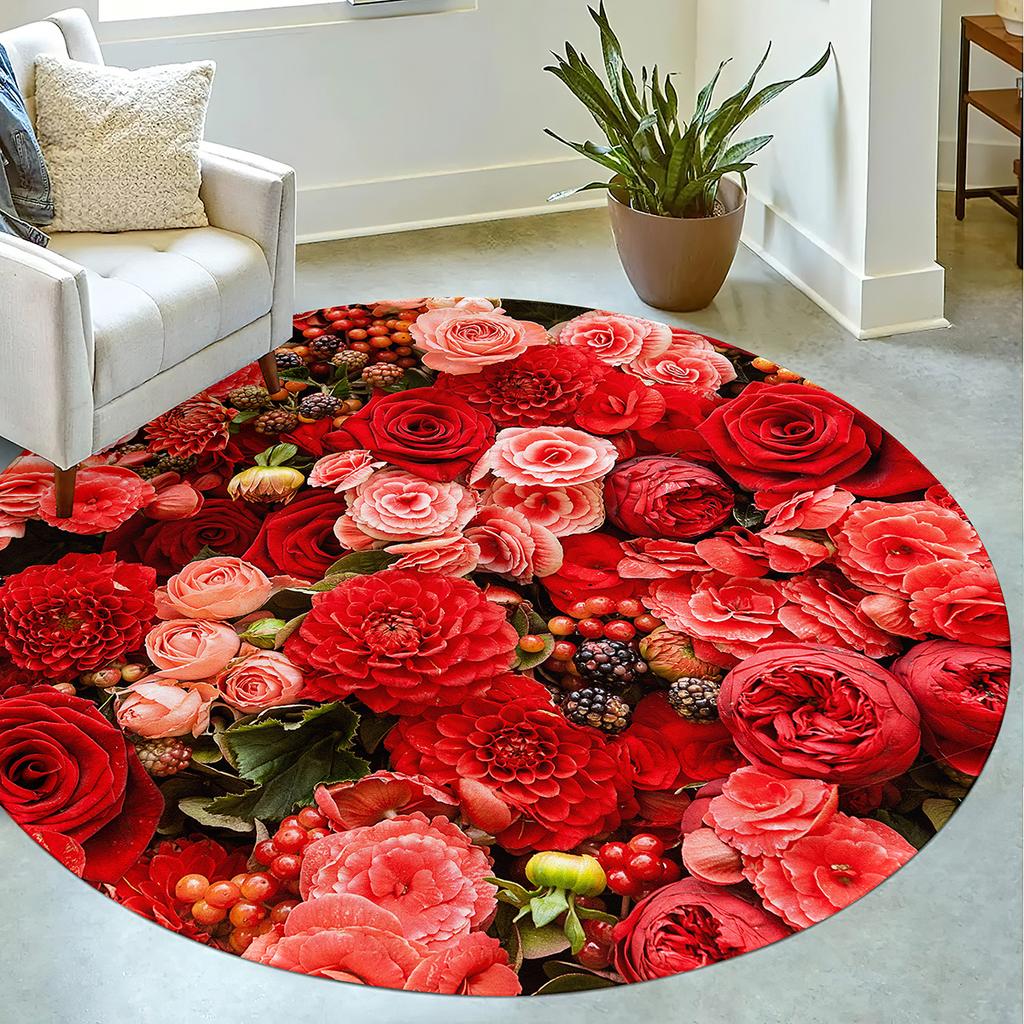 Luxurious Red Floral Pattern Round Shape Floor Mats Kitchen Hallway Runner Rug Bedroom Living Room Soft Carpet Non-slip Area Rug