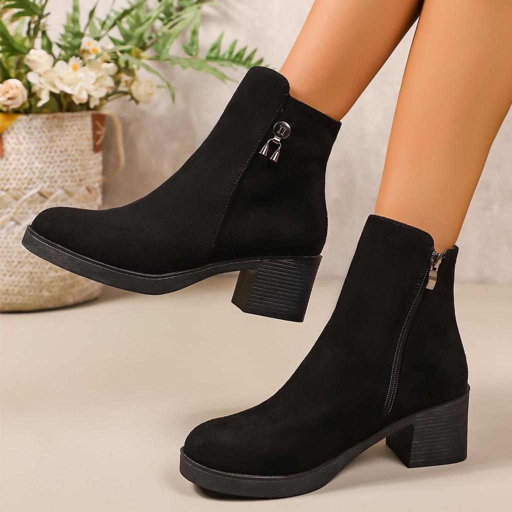2025 Autumn/Winter Women's Black Suede Chunky Heel Ankle Boots with Side Zipper – Versatile Mid-Heel for Commuting