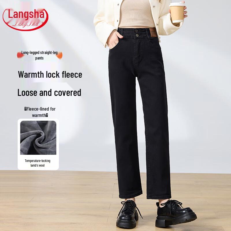 LANGSHA Women's High-Waist Fleece-Lined Straight-Leg Jeans