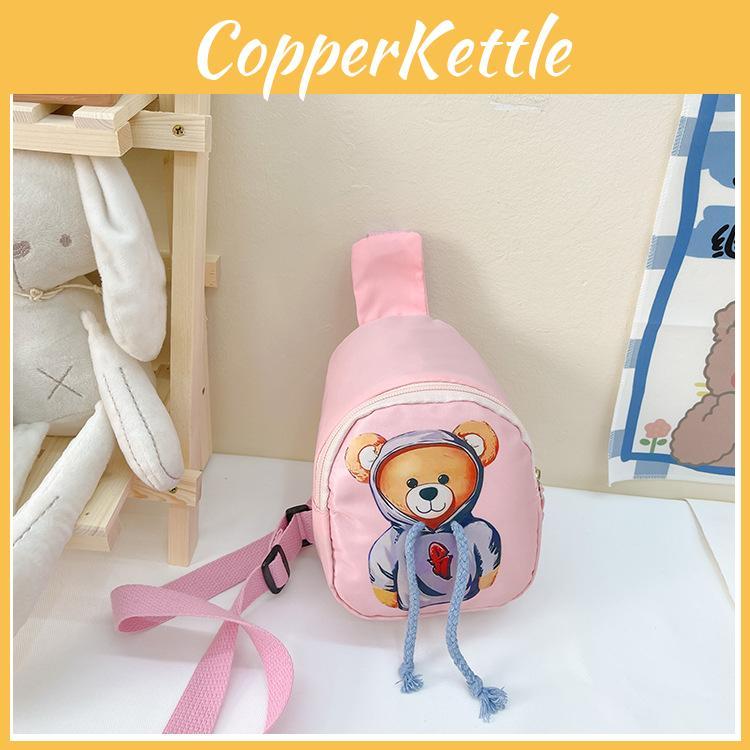 This children's chest bag features a compact design. Crafted from durable Oxford cloth with a soft nylon lining, it offers reliable protection for essentials during daily activities. The playful cartoon bear pattern enhances its charming appearance, making it suitable for school-age children who enjoy vibrant accessories.
