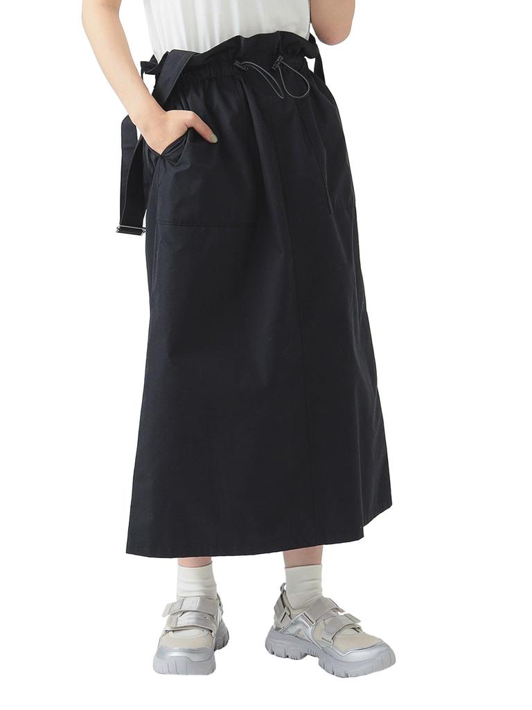 This jumper skirt features a drawstring waist detail. The fabric has been updated this season. The shoulder straps are detachable, so it can also be worn as a skirt.