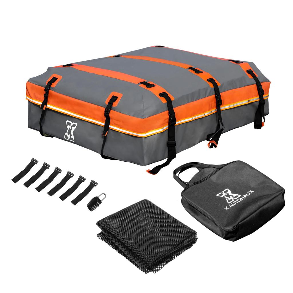 Secure the cargo carrier securely with reinforced, adjustable straps for safety. The cargo bag won't slip or scratch your vehicle, even on highways or bumpy roads. The non-slip rooftop cargo mat is suitable for most cars, trucks, or SUVs, regardless of whether they have a roof rack or side rails. The roof bag (50.39*37.01*9.84 inches) was designed to address space constraints within your vehicle. The 20-cubic-foot rooftop cargo carrier can hold 4-6 suitcases, travel luggage, tents, sleeping bags, and more. Free up interior space for a more comfortable trip. Easy to install, the rooftop cargo carrier fits most cars, trucks, or SUVs. If your vehicle doesn't have roof side rails, it can be easily installed in minutes using the six door hooks.