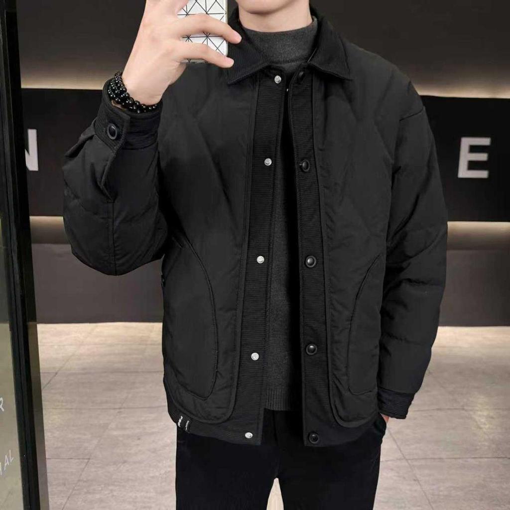 Stay stylish and warm this winter with this lightweight down jacket. Designed for men, this short and thickened coat features a sleek tailor neckline that adds a touch of sophistication. Insulated with premium goose down, it offers exceptional warmth without the bulk. The jacket is crafted from high-quality corduroy, providing a unique texture and enhanced durability. Perfect for modern men seeking a trendy look without compromising on comfort during the colder months.
