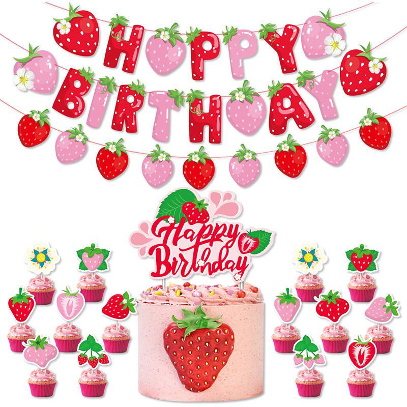 Lovely Strawberry Theme Party Supply Paper Banner Cake Topper Pink Latex Balloons Girl Birthday Baby Shower Parties Decoration