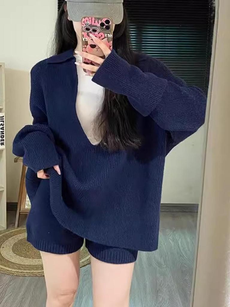 Women's Relaxed V-neck Sweater & Shorts Set - Autumn/Winter Casual Knit Two-piece