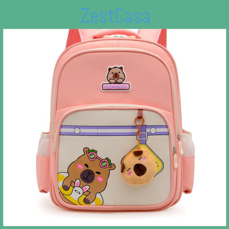 This lightweight kids' backpack features a colorful cartoon capybara design made from durable nylon material, includes breathable padded shoulder straps for comfort. Designed to support school activities, it offers ample storage for daily essentials. Wipe clean with a damp cloth to maintain its appearance.