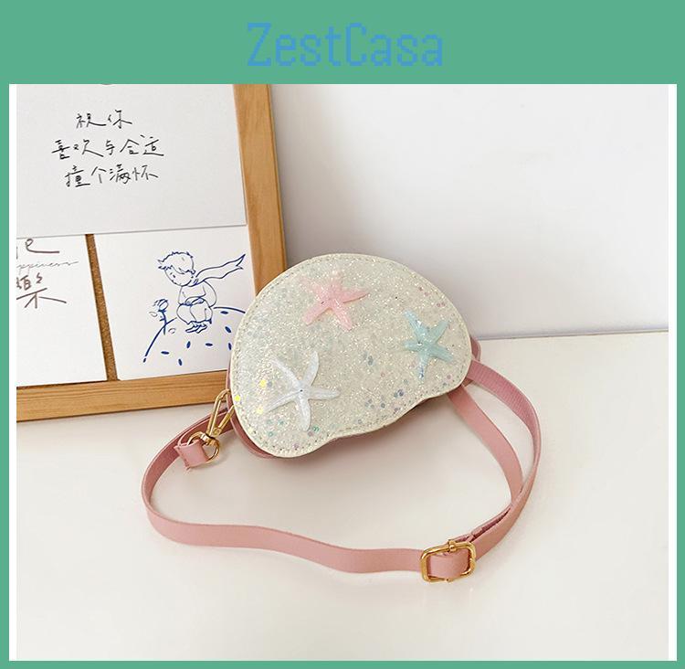 This children's fashion shoulder bag features a sparkling sequin design with a cute cartoon star and shell pattern, enhancing playful style. Made of durable PU leather. Ideal for daily outings, it supports breathable and wear-resistant use, with a secure zip closure and a single shoulder strap. Users can wipe clean with a damp cloth for maintenance.