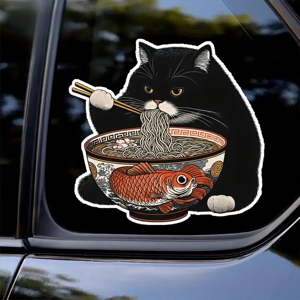 2 Pieces 13x12cm Black Cat Eating Ramen Funny Waterproof Vinyl Car Decal Exterior Decor