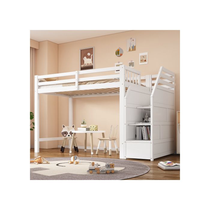 Lit Mezzanine - MUVOE - 90x200 Cm - Bois Massif - Échelle De Rangement - Garde-corps Sécurisé
